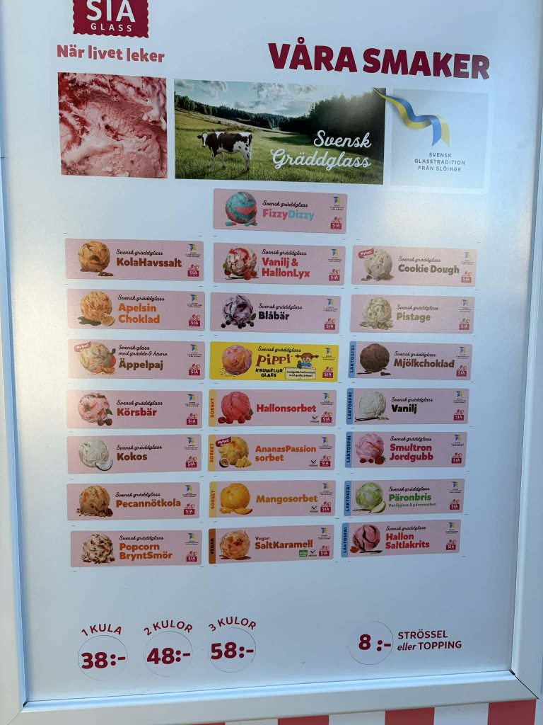 Det vi säljer: Korv, Kaffe, Dricka, Styckglass, Kulglass, Mjukglass, Våfflor, Varma chips, Slush.